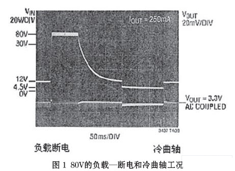 “冷曲軸”(cold crank)段,發(fā)生在汽車發(fā)動機經(jīng)受冷卻或凝固期間,發(fā)動機油變的非常粘滯。因而要求起動機輸出更大的轉(zhuǎn)矩,相繼需要蓄電池提供更大的電流。這一大的電流負載導(dǎo)致蓄電池/一次母線的電壓降低,甚至低于4V的點火電壓。隨后,又回復(fù)至額定電壓13.8V(圖1)。這在某些應(yīng)用場合,例如發(fā)動電機控制、安全系統(tǒng)和導(dǎo)航系統(tǒng)均不可避免。故要求具有良好調(diào)節(jié)的輸出電壓(一般為3.3V)貫穿“冷曲軸”段,以實現(xiàn)全過程的無間斷(連續(xù))運行。