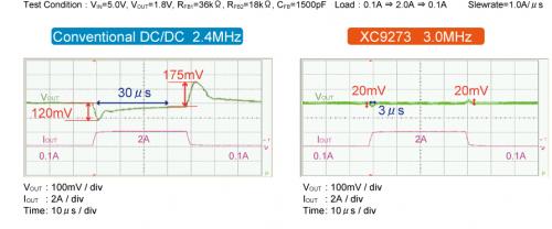 ▲図1 與過(guò)去的產(chǎn)品的高速瞬態(tài)響應(yīng)比較