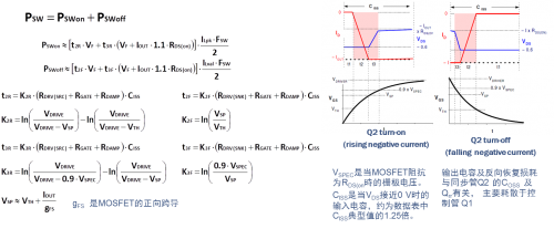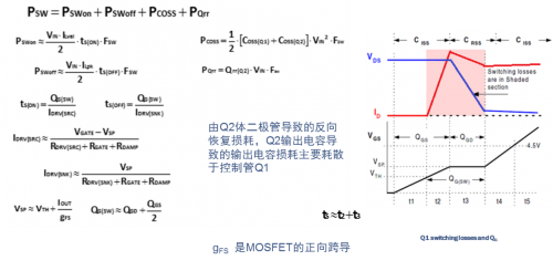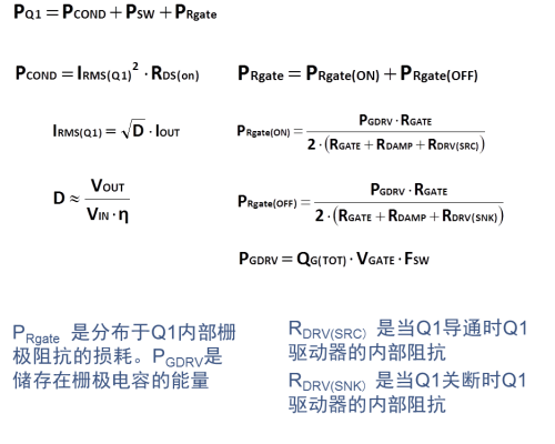 對(duì)于高頻應(yīng)用(>MHz),控制管Q1的選用應(yīng)針對(duì)降低開(kāi)關(guān)損耗進(jìn)行優(yōu)化。Q1損耗的計(jì)算公式如下: