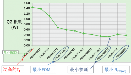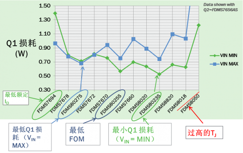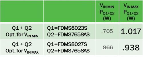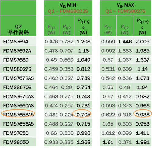 為優(yōu)化轉(zhuǎn)換器能效,首先根據(jù)VIN選擇損耗最小的Q1,然后選擇產(chǎn)生損耗最小的Q2。本例中, 無(wú)論VIN最小或最大,最佳的Q2是相同的,都為FDMS7658AS(但并不總是如此,特別是具有寬VIN范圍或高FSW時(shí))。