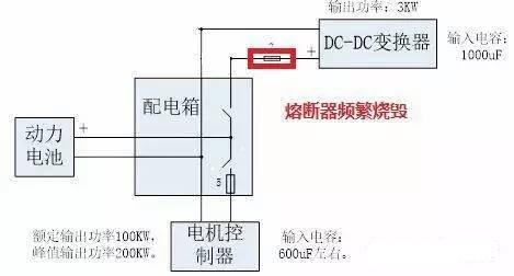 電機(jī)控制器的電容出了問題,不足負(fù)載需求,需要快速充電時(shí)DC/DC內(nèi)的電容放電了(電流往回走),所以導(dǎo)致這個(gè)熔斷器損壞。
