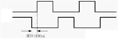 對(duì)于半橋、全橋和LLC諧振等一些H橋或半H橋的拓?fù)潆娫?,PWM的死區(qū)時(shí)間設(shè)定對(duì)電源可靠性至關(guān)重要。實(shí)際上設(shè)定死區(qū)時(shí)間實(shí)則為了避免上、下管直通從而導(dǎo)致電源炸機(jī),也就是說設(shè)定一段上、下管同時(shí)關(guān)斷的時(shí)間,在上管關(guān)斷后延遲一段時(shí)間再導(dǎo)通下管或在下管關(guān)斷后延遲一段時(shí)間再導(dǎo)通上管,如圖 2所示td即為死區(qū)時(shí)間。