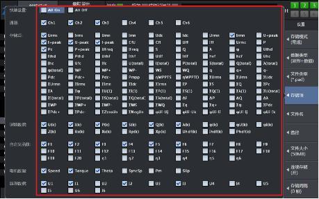第五,存儲(chǔ)項(xiàng)是設(shè)置中最關(guān)鍵的一步,點(diǎn)開存儲(chǔ)項(xiàng)菜單后,會(huì)看到功率分析儀所能分析記錄的所有數(shù)據(jù),我們根據(jù)自己的需要進(jìn)行勾選對應(yīng)通道和參數(shù),只有完成存儲(chǔ)項(xiàng)的設(shè)置,才能記錄對應(yīng)的數(shù)據(jù);