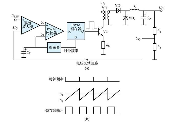 電壓控制是開(kāi)關(guān)電源最常用的一種控制類(lèi)型。以降壓式開(kāi)關(guān)穩(wěn)壓器(即Buck變換器)為例,電壓控制型的基本原理及工作波形分別如圖1 (a)、(b)所示。其特點(diǎn)是首先通過(guò)對(duì)輸出電壓進(jìn)行取樣(必要時(shí)還可增加取樣電阻分壓器),所得到的取樣中壓UQ就作為控制環(huán)路的輸入信號(hào)。然后對(duì)取樣電壓和基準(zhǔn)電壓UREF進(jìn)行比較,并將比較結(jié)果放大成誤差電壓Ur,再將Ur送至PWM比較器與鋸齒波電壓Uj進(jìn)行比較,獲得脈沖寬度與誤差電壓成正比的調(diào)制信號(hào)。圖1 (a)中的振蕩器有兩路輸出,一路輸出為時(shí)鐘信號(hào)(方波或矩形波),另一路為鋸齒波信號(hào), CT為振蕩電容。T為高頻變壓器,VT為功率開(kāi)關(guān)管。降壓式輸出電路由整流二極管VD1、續(xù)流二極管VD2、儲(chǔ)能電感L和濾波電容Co組成。PWM鎖存器的R為復(fù)位端,S為置位端。