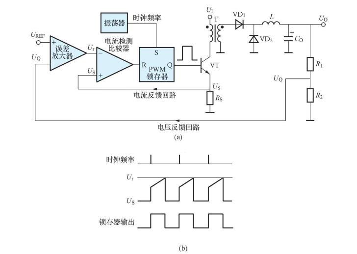 電流控制型是在電壓控制環(huán)的基礎(chǔ)上又增加了電流控制環(huán),其基本原理及工作波形分別如圖2 (a)、(b)所示。Us為電流檢測(cè)電阻的壓降,此時(shí)PWM比較器變?yōu)殡娏鳈z測(cè)比較器。電流控制型需通過(guò)檢測(cè)電阻來(lái)檢測(cè)電流,并且可逐個(gè)周期的限制電流,便于實(shí)現(xiàn)過(guò)電流保護(hù)。固定頻率的時(shí)鐘脈沖將RS鎖存器置位,從Q端輸出的驅(qū)動(dòng)信號(hào)為髙電平,使功率開(kāi)關(guān)管VT導(dǎo)通,髙頻變壓器一次側(cè)的電流線性地增大。當(dāng)電流檢測(cè)電阻Rs上的壓降達(dá)到并超過(guò)Ur時(shí),電流檢測(cè)比較器翻轉(zhuǎn),輸出的高電平將鎖存器復(fù)位,從Q端輸出的驅(qū)動(dòng)信號(hào)變?yōu)榈碗娖?,令幵關(guān)管關(guān)斷,直到下一個(gè)時(shí)鐘脈沖使RS鎖存器置位。