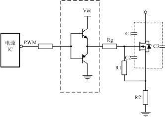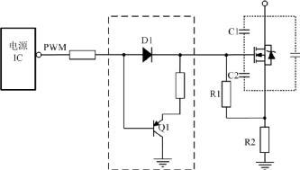 如果選擇MOS管寄生電容比較大,電源IC內(nèi)部的驅(qū)動能力又不足時,需要在驅(qū)動電路上增強(qiáng)驅(qū)動能力,常使用圖騰柱電路增加電源IC驅(qū)動能力,其電路如圖 2虛線框所示。