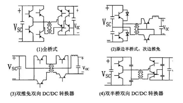 隔離型雙向DCDC,在非隔離型雙向DCDC轉(zhuǎn)換器的基礎(chǔ)上加上一個高頻變壓器就構(gòu)成了隔離型雙向DCDC轉(zhuǎn)換器,高頻變壓器兩側(cè)的電路拓?fù)淇梢允侨珮蚴?、半橋式、推挽式等等。這幾種隔離型的雙向DCDC轉(zhuǎn)換器,采用了更多的功率開關(guān),電壓變比大,帶電氣隔離等優(yōu)點(diǎn)。但是這類DCDC轉(zhuǎn)換器結(jié)構(gòu)復(fù)雜,成本也相對較高,轉(zhuǎn)換器的損耗高,低頻時會導(dǎo)致隔離變壓器鐵芯飽和,損耗會進(jìn)一步增加。因此,非隔離型雙向DCDC轉(zhuǎn)換器比隔離型在電動汽車上運(yùn)用更具有優(yōu)勢。