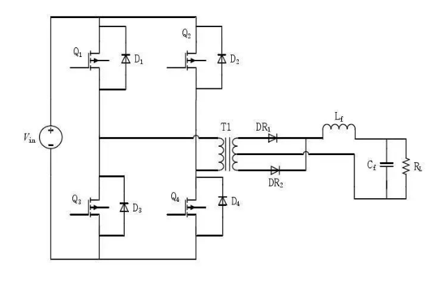上圖中,Vin為輸入電壓,需要通過DCDC回路,在輸出端得到一個需要的輸出電壓。原邊開關(guān)電路,將輸入電流調(diào)制成矩形波,這個過程主要依靠控制器調(diào)制特定占空比的PWM波,用以驅(qū)動四個開關(guān)管按照既定的順序和時間開閉,從而實(shí)現(xiàn)電流逆變過程。原邊輸入電壓可以通過占空比調(diào)節(jié),占空比增加輸出電壓也增加,占空比減小輸出電壓減小。頻率則可以通過調(diào)節(jié)開關(guān)頻率調(diào)節(jié)。T1位變壓器,變比你n。變壓器既可以實(shí)現(xiàn)電氣隔離,又可以起到電壓調(diào)節(jié)的作用。一個固定的原邊線圈匝數(shù),副邊改變匝數(shù),即可得到不同的電壓等級。變壓器的輸入,是經(jīng)過左側(cè)全橋電路逆變得到的脈沖矩形波,傳遞到變壓器的副邊,得到的是另一個電壓幅值的交流正弦波。經(jīng)過DR1和DR2整流以后,再經(jīng)由Cf和Rl濾波處理,得到直流電,提供給輸出端。