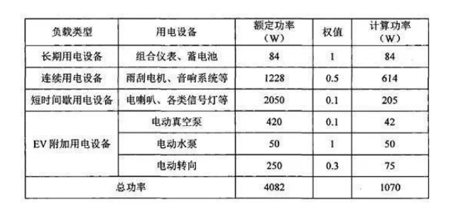 根據(jù)純電動汽車車載電子設(shè)備的不同屬性,能把用電設(shè)備分為長期用電、連續(xù)用電、短時間間歇用電和附加用電設(shè)備種類型,并賦于不同的權(quán)值。其中,長期用電設(shè)備包括組合儀表和蓄電池,權(quán)值取1;連續(xù)用電設(shè)備包括雨刮、電機(jī)、音響系統(tǒng)和儀表照明等設(shè)備,權(quán)值可取0.5;短時間間歇用電設(shè)備包括電喇機(jī)、各類信號燈、控制器等設(shè)備,權(quán)值可取0.1;附加用電設(shè)備電動真空泵、電動水泵和電動轉(zhuǎn)向,權(quán)值根據(jù)實(shí)際情況分別取0.1、1、0.3。各類設(shè)備所消耗功率分析如表所示。